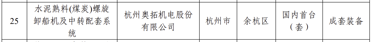 近日,杭州奥拓机电股份有限公司(以下简称“奥拓股份”)自主研发的“水泥熟料(煤炭)螺旋卸船机及中转配套系统”,成功获评国内首台(套)装备认定。该装备属于国家重点支持的高端装备产业领域,是港口物流中补短...
