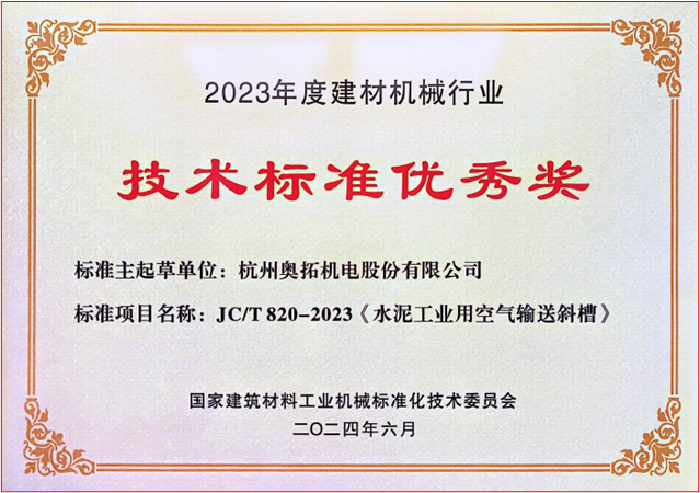 奥拓股份主导的JC/T 820-2023《水泥工业用空气输送斜槽》获得“2023年度建材机械行业技术标准优秀奖”表彰。